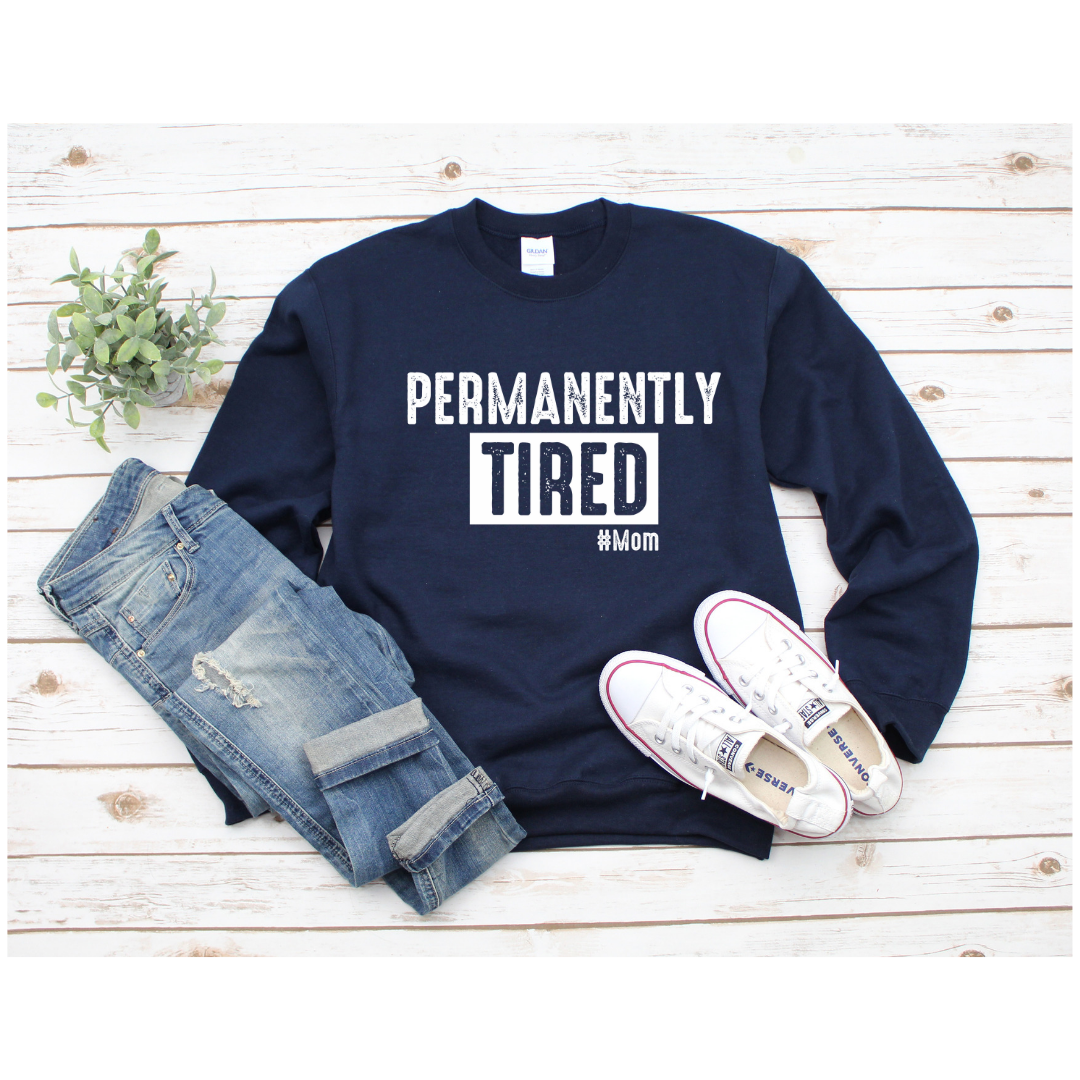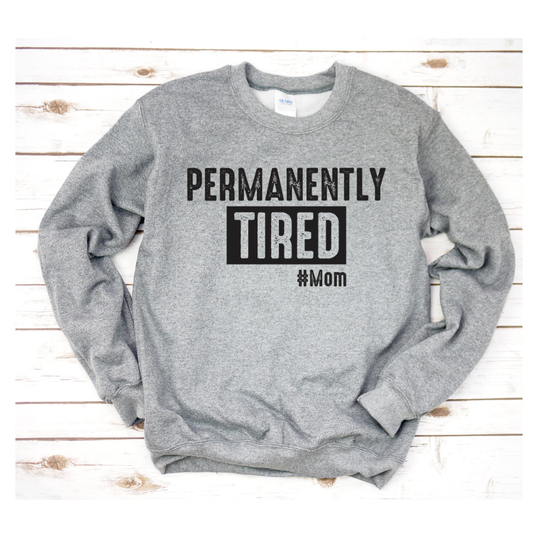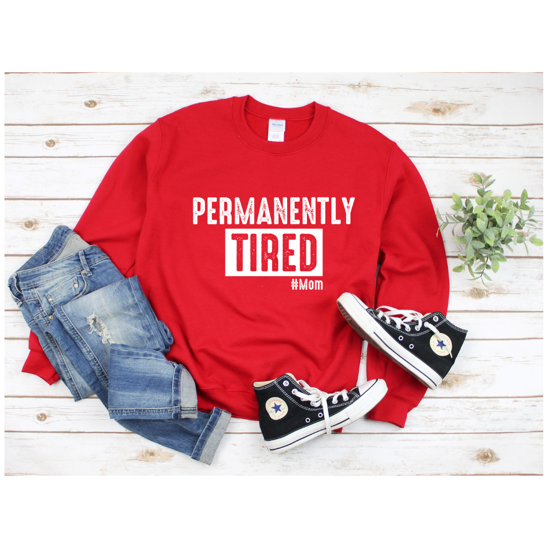 Permanently Tired Red, Crewneck Unisex Sweatshirt is comfortable and an easy grab and go for any outing with the kids.